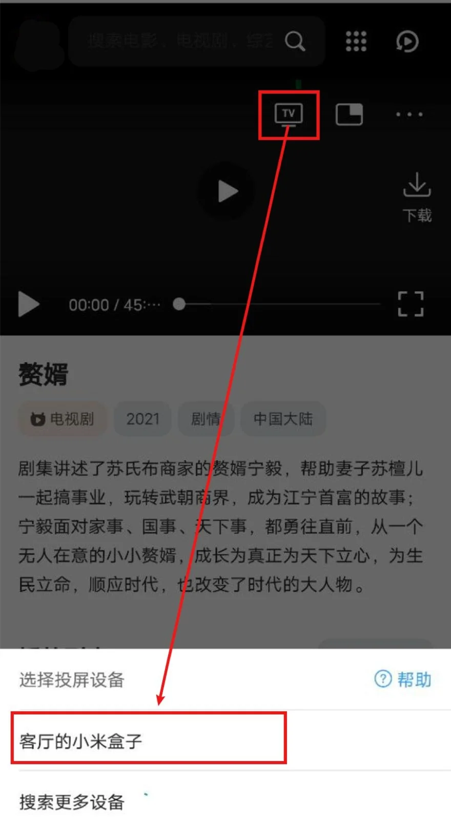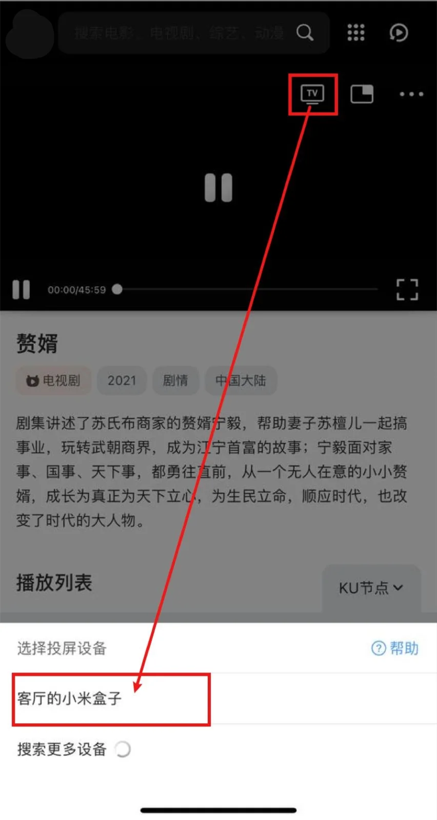 打开QQ浏览器(会接管网页播放器)->打开NYAPP视频->播放视频->选中投屏图标->等待搜寻出智能电视/电视盒子->选中,即可投屏。